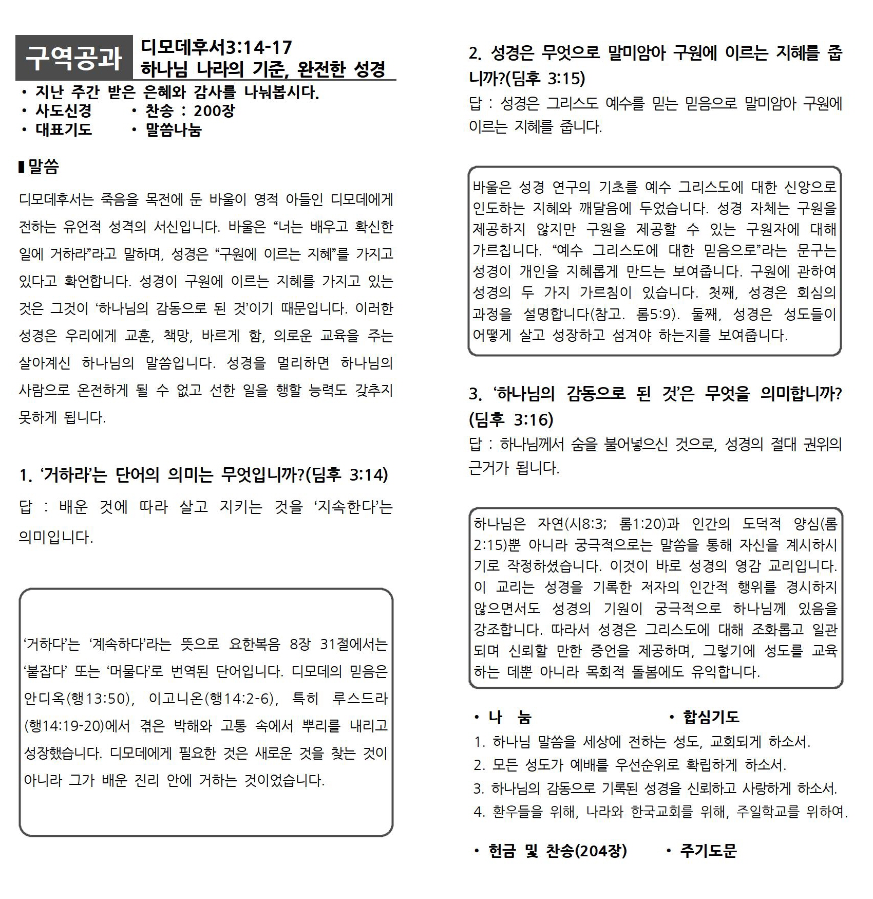 | 다음글 | 1월 셋째주 구역공과 | 운영자 | 2024.01.13 | 0 | 189 |