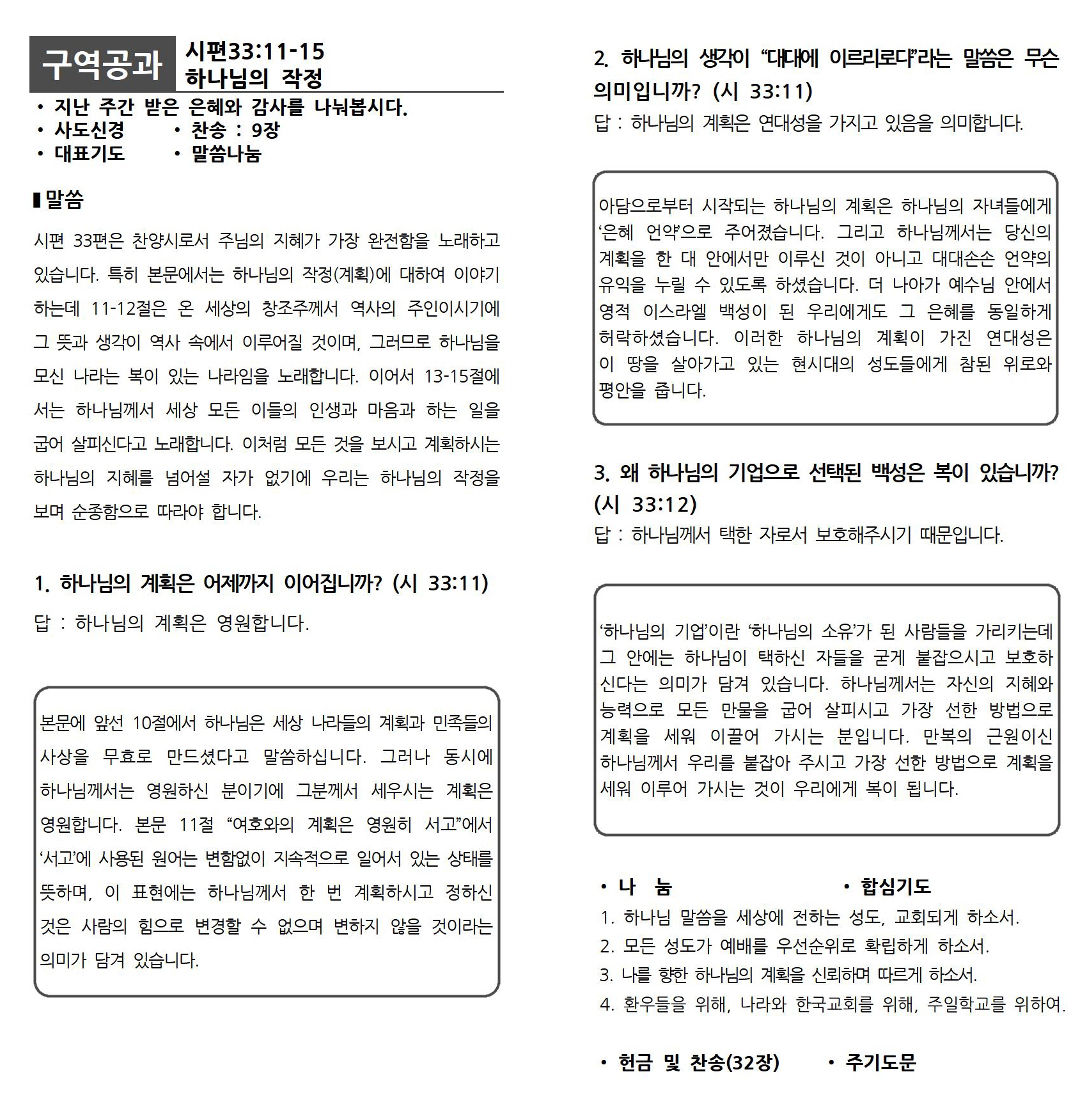| 다음글 | 3월 첫째주 구역공과 | 운영자 | 2024.03.02 | 0 | 186 |
